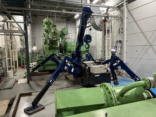 カニクレーンは四つ足を広げて地面に設置できるため狭い場所でも安定した作業が可能です。