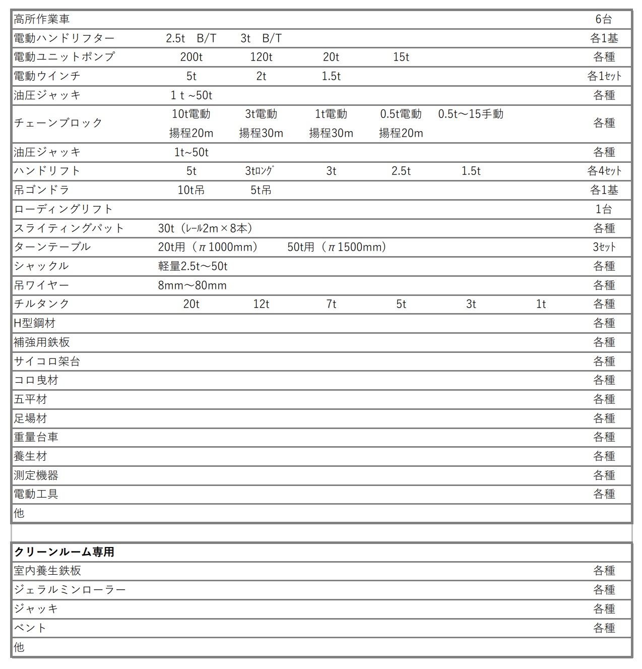 メーカー種類保有台数せり上げ能力揚程ジャッキ中心間距離